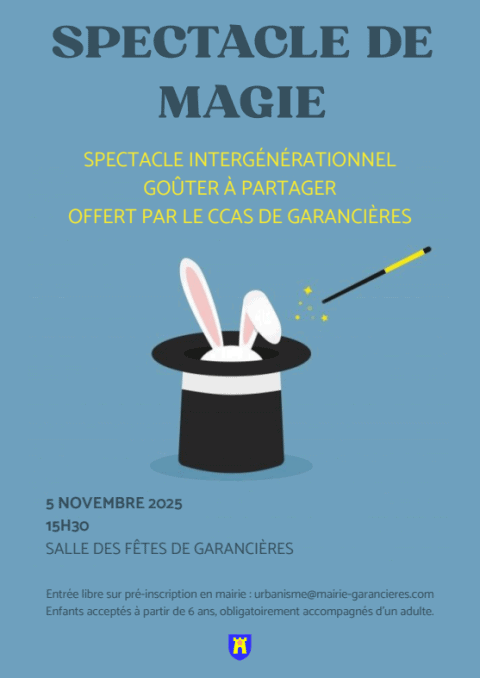 Le CCAS de Garancières vous invite à un spectacle de magie intergénérationnel (à partir de 6 ans) le Mercredi 5 Novembre à 15h30 à la salle des fêtes (participation sur pré-inscription car places limitées)